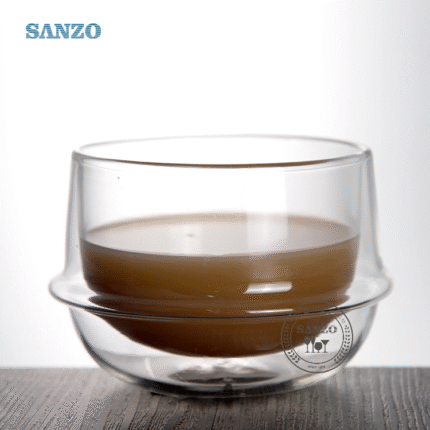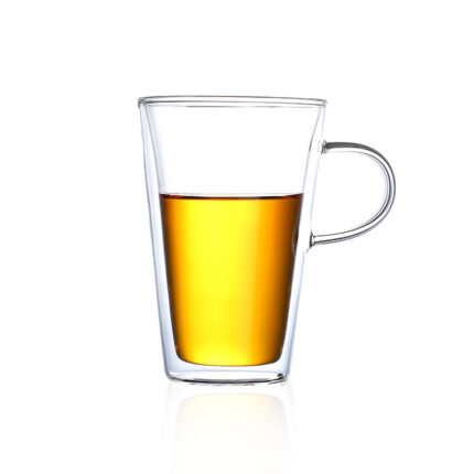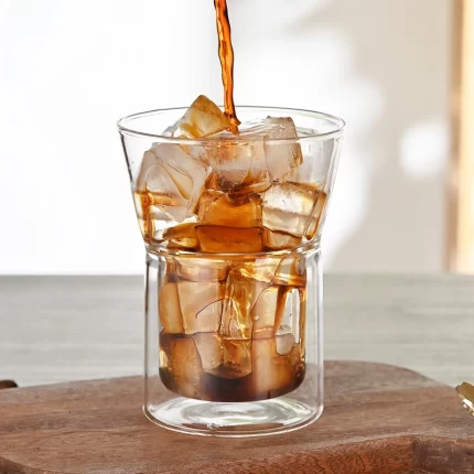 This double-layer glass cup has a unique design, with the inner layer resembling a regular inverted conical cup and the outer layer forming a cylindrical space to accommodate the inner cup. Due to its double-layer structure, it has the characteristics of insulation or thermal insulation, making it safer and more comfortable to drink hot or cold drinks, both practical and visually appealing.