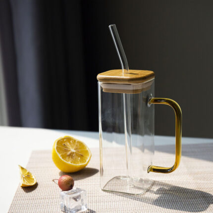 Color Handle Transparent Square Glass Korean Simple Red Square Glass Cup Household Transparent