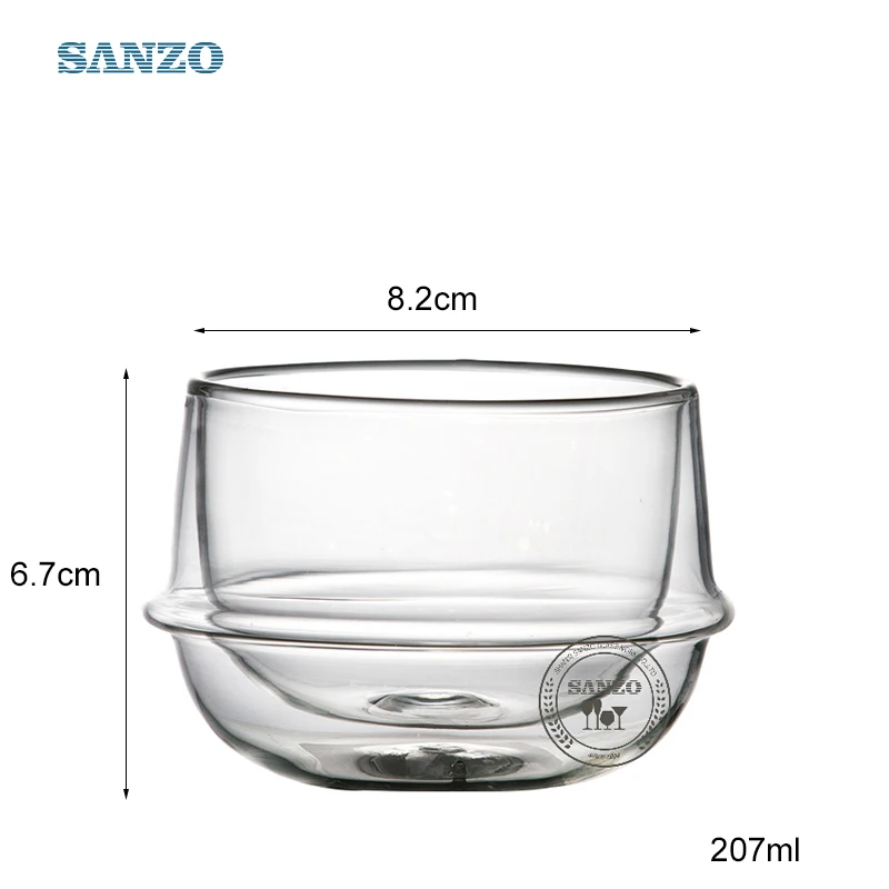This double-layer glass cup has a unique design, with the inner layer resembling a regular inverted conical cup and the outer layer forming a cylindrical space to accommodate the inner cup. Due to its double-layer structure, it has the characteristics of insulation or thermal insulation, making it safer and more comfortable to drink hot or cold drinks, both practical and visually appealing.