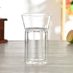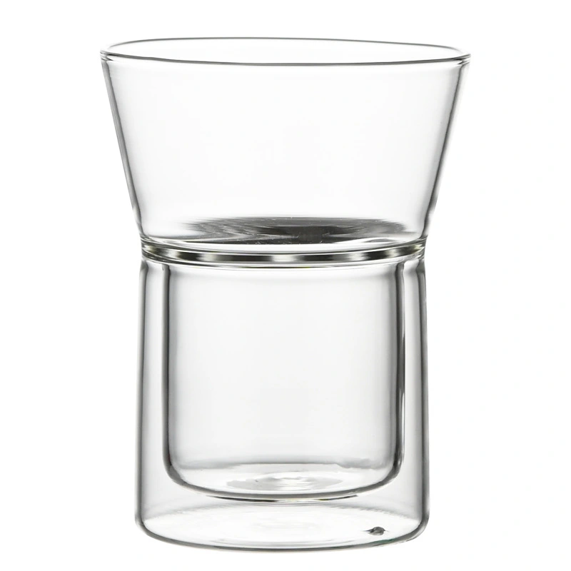 This double-layer glass cup has a unique design, with the inner layer resembling a regular inverted conical cup and the outer layer forming a cylindrical space to accommodate the inner cup. Due to its double-layer structure, it has the characteristics of insulation or thermal insulation, making it safer and more comfortable to drink hot or cold drinks, both practical and visually appealing.
