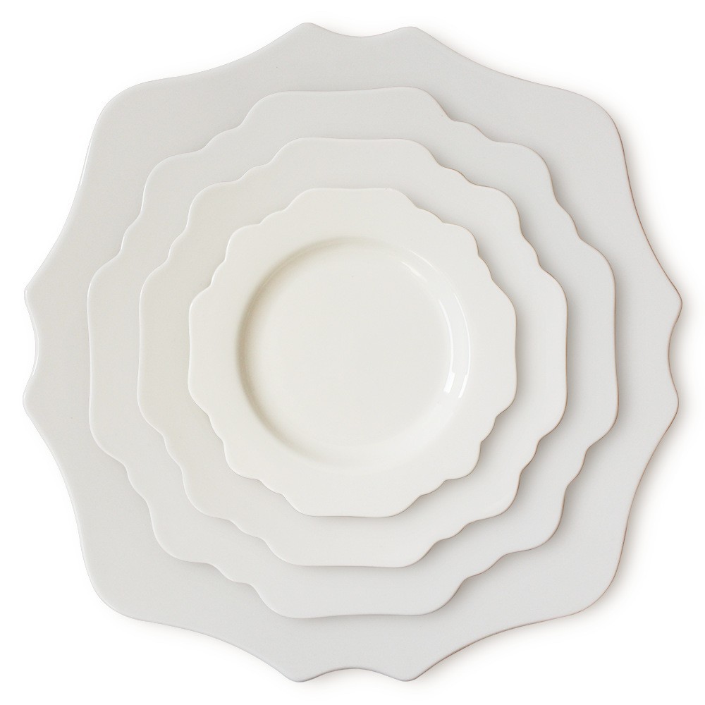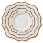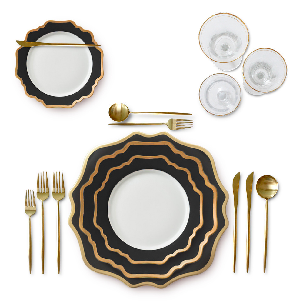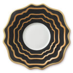 It features an irregular, wavy edge made up of multi-layered black and gold lines that crisscross and stack, creating a sense of depth. The black background appears especially profound, while the gold lines add a luxurious feel to this piece of dinnerware.