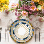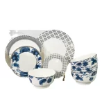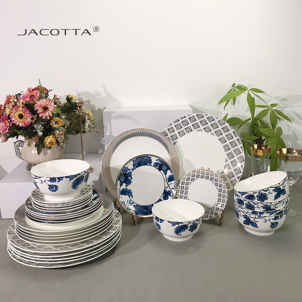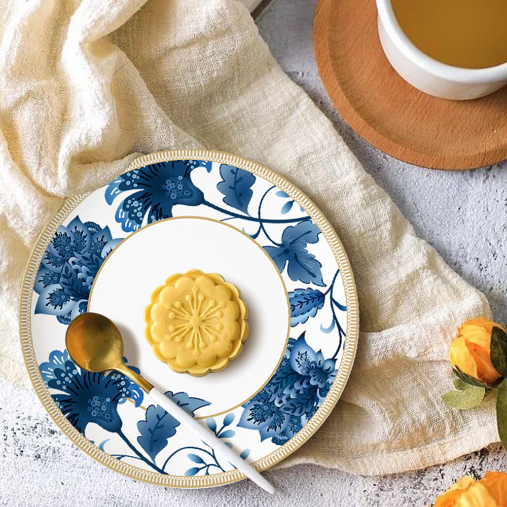 The design on the dinnerware showcases a traditional blue and white porcelain style, with classic blue used to depict floral patterns against a white background, creating a classical and elegant feel. Meanwhile, the edges of some plates feature geometric shapes and linear designs, adding a touch of modernity and a sense of understated luxury.