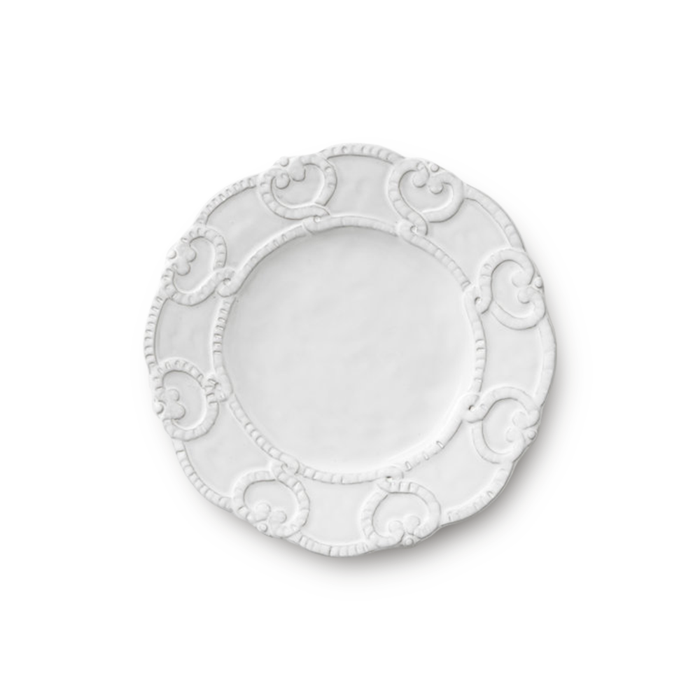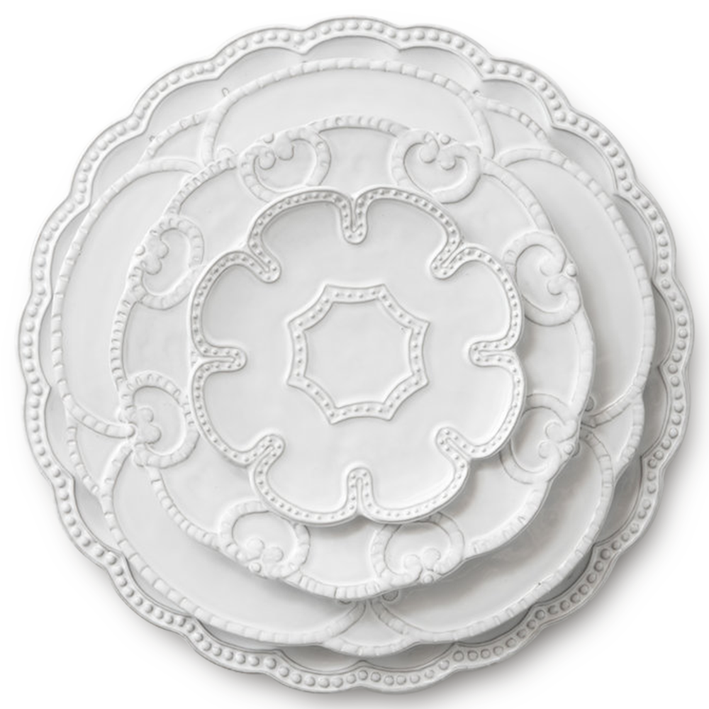 This dinnerware set features a European vintage style, showcasing exquisite craftsmanship. Each plate boasts a unique embossed design adorned with intricate lines and patterns, creating a rich decorative arts style. The pure white color emphasizes its fine details, conveying a sense of sophistication and elegant character