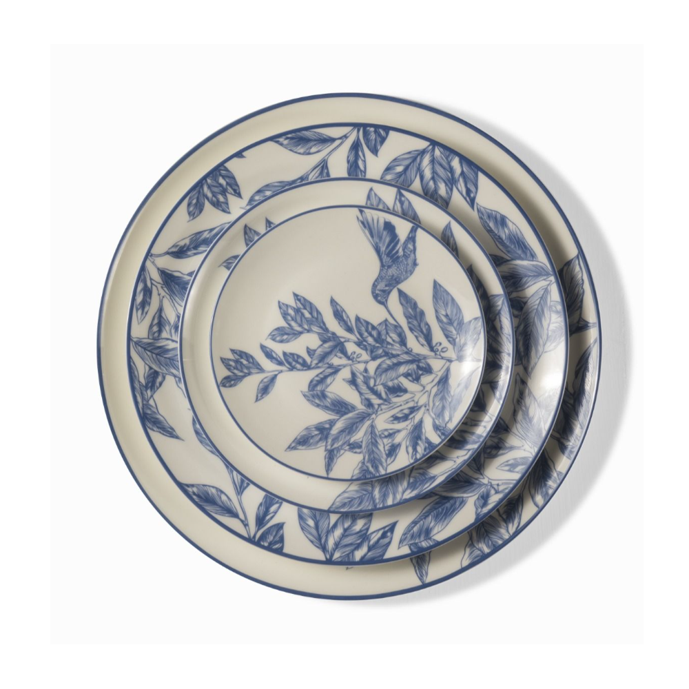 The design on the dinnerware showcases a traditional blue and white porcelain style, with classic blue used to depict floral patterns against a white background, creating a classical and elegant feel. Meanwhile, the edges of some plates feature geometric shapes and linear designs, adding a touch of modernity and a sense of understated luxury.