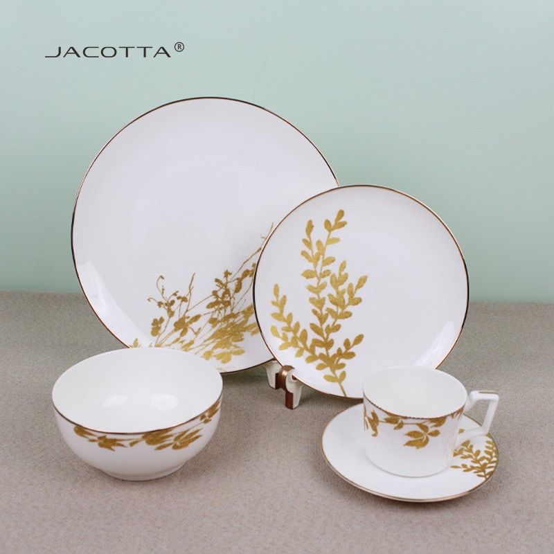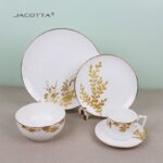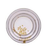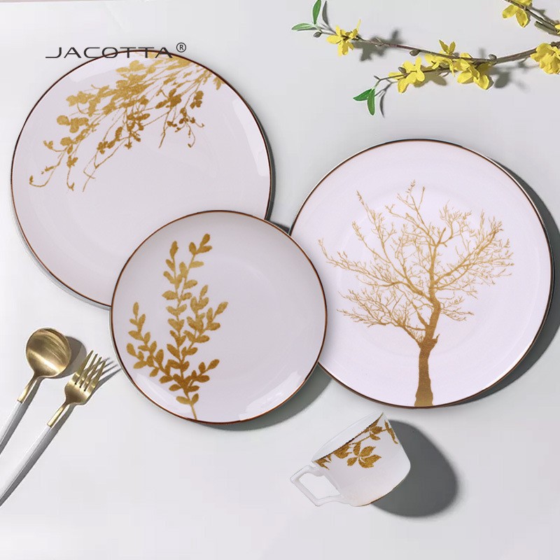 This set of dinnerware is designed to be simple yet elegant, with each piece featuring a gold trim and decorations, imparting a warm and sophisticated feel.