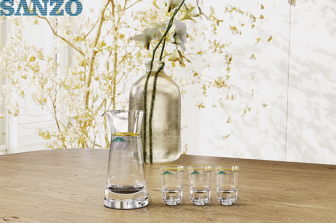 Chinese style bamboo cup crystal glass gold print baijiu dispenser shot glasses set