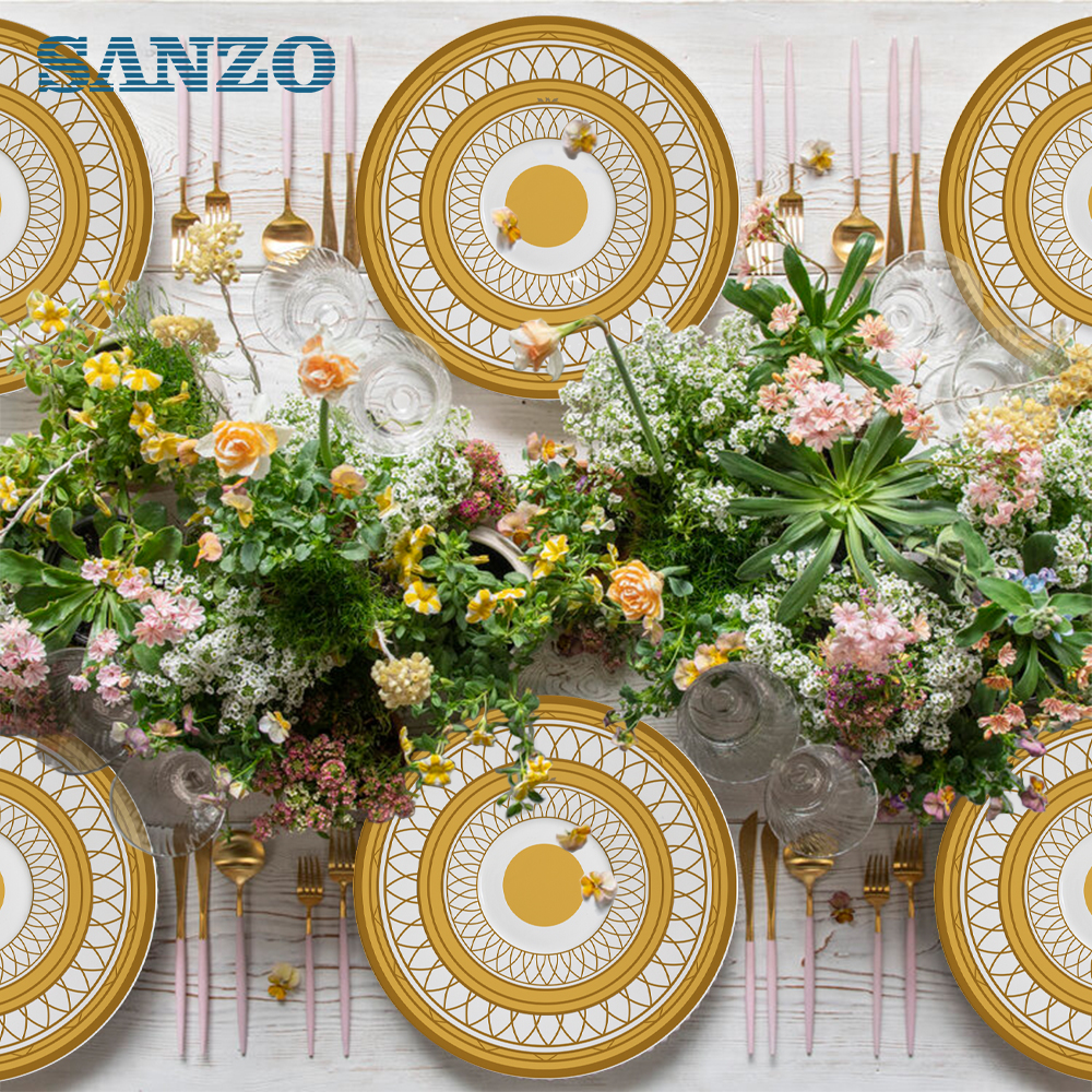 Customize LOGO Household Hotel Gold Rim White Ceramic Dishes Flat Plate